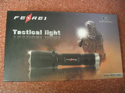 Here is a very good tactical flashlight - the F7 style presented with corresponding beamshots. This recessed tail switch flashlight comes with a high capacity 3400 mAH 3.7 Volt lithium-ion battery, an A.C. charger transformer, and a single battery charging bay. It draws close to 2.6 amps of current (when fully charged) for a total power consuption of nearly 9.5 watts. It has a nice tight beam which can reach 330 lumens on HIGH mode.